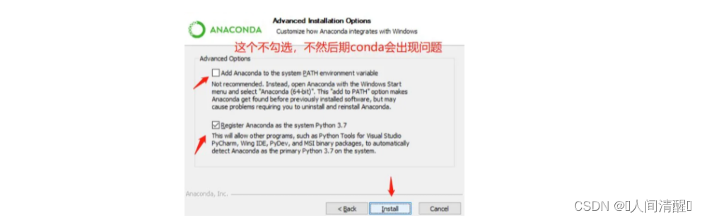一路next,注意不要让anaconda自动配置环境变量,后期可能会出现问题。