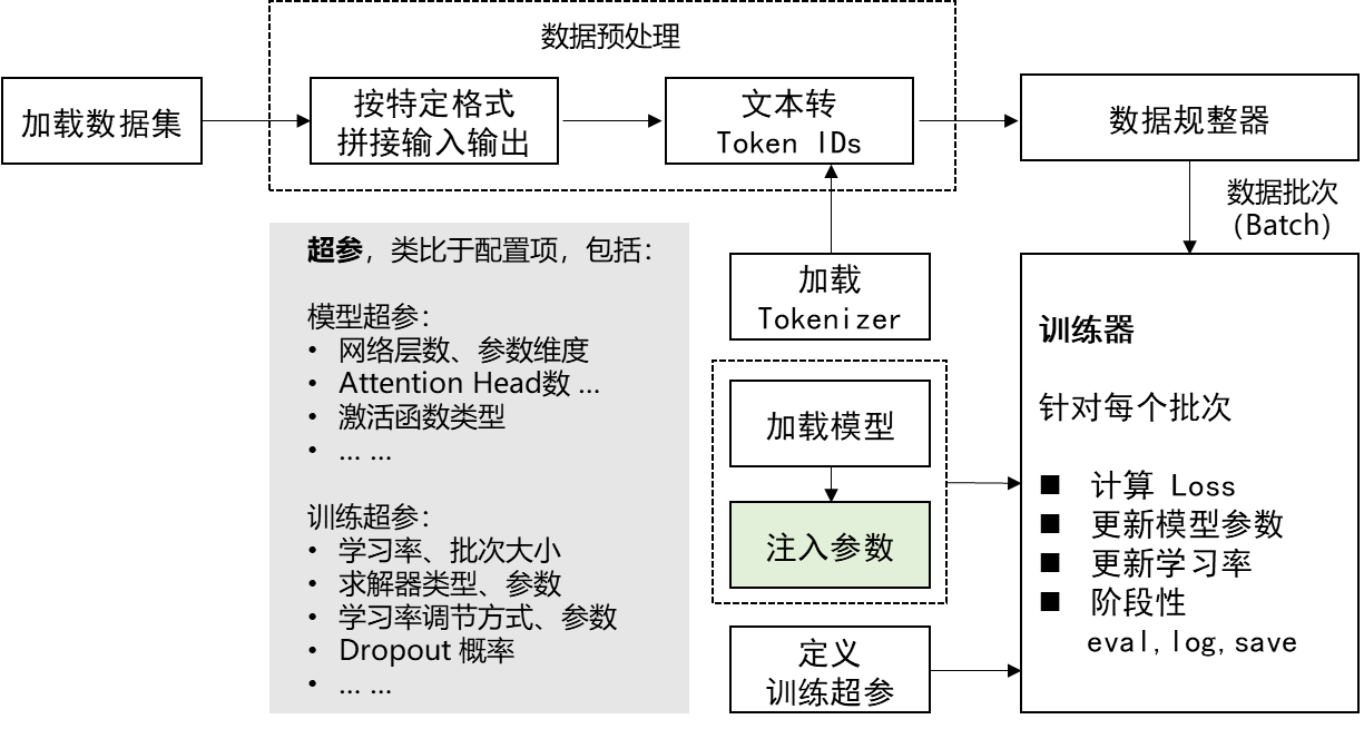 - 加载预训练 Tokenizer:AutoTokenizer.from_pretrained(MODEL_NAME_OR_PATH)