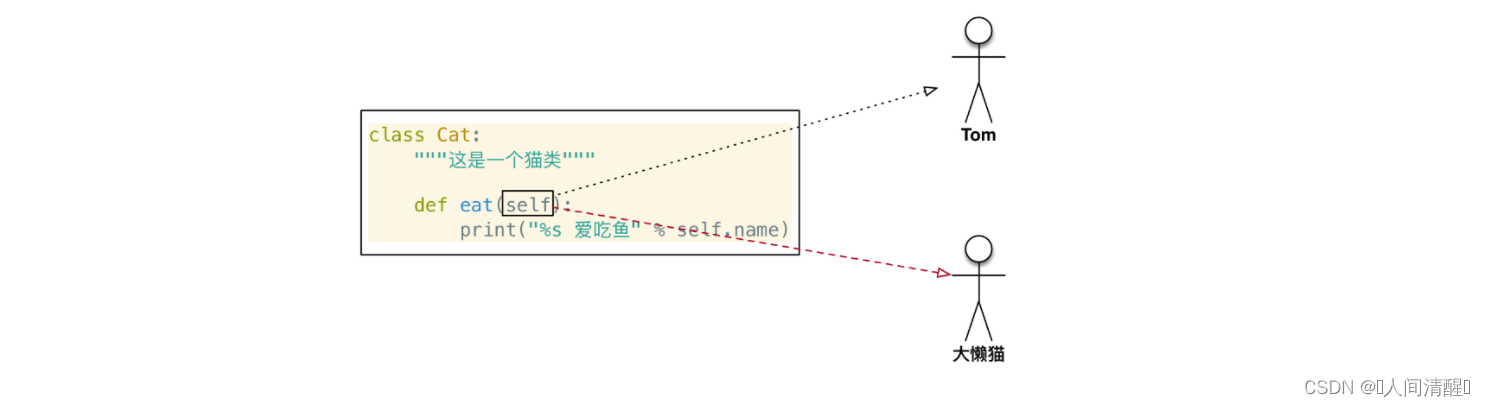 • 在类封装的方法内部,self 就表示 当前调用方法的对象自己