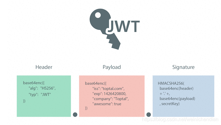 现在多采用JWT代替Session,JWT使用JSON来保存令牌信息,并不把信息保存在服务端,而是保存在客户端。JWT的结构包括头部、负载和签名:
