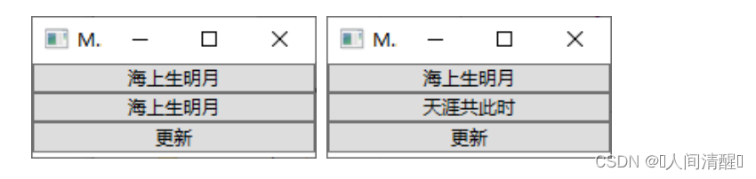| <Window x:Class="WpfApp1.MainWindow" xmlns="http://schemas.microsoft.com/winfx/2006/xaml/presentation" xmlns:x="http://schemas.microsoft.com/winfx/2006/xaml" xmlns:d="http://schemas.microsoft.com/expression/blend/2008" xmlns:mc="http://schemas.openxmlformats.org/markup-compatibility/2006" xmlns:sys="clr-namespace:System;assembly=mscorlib" xmlns:local="clr-namespace:WpfApp1" mc:Ignorable="d" Title="MainWindow" Height="100" Width="200"> <Window.Resources> <TextBlock x:Key="res1" Text="海上生明月"/> <TextBlock x:Key="res2" Text="海上生明月"/> </Window.Resources> <StackPanel> <Button Content="{StaticResource res1}"/> <Button Content="{DynamicResource res2}"/> <Button Content="更新" Click="Button_Click"/> </StackPanel> </Window>