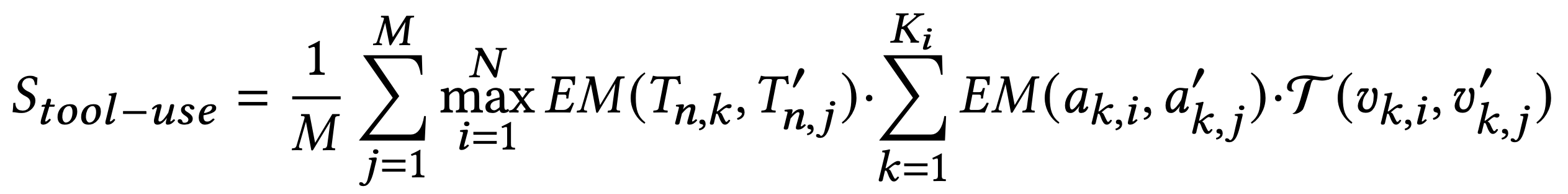 其中,$ T_{n,i} $ 为 Groud Truth 中的工具名称,$ T’_{n,j} $ 为 待测试的 Agent Response 中的工具名称,EM为精确匹配(Exact Match,直接进行字符串精确匹配),结果为 0 或 1;