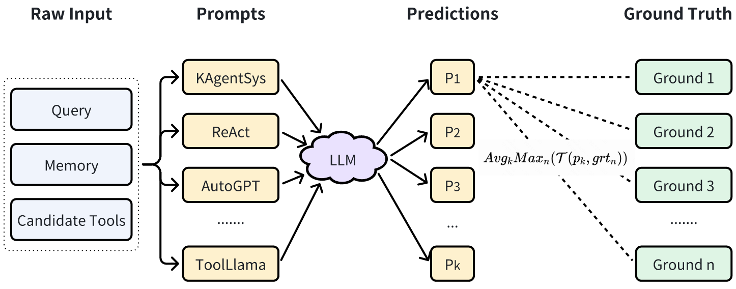 - 将一批相同的 query 分别插入到经过验证的标杆模板中(如AutoGPT、ToolLLaMA等)和 Meta-Agent 生成的 prompt 模版中,形成 prompt pair;