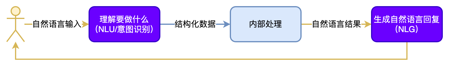 把输入的自然语言对话,转成结构化 的信息(NLU) 用传统软件手段处理结构化信息,得到处理策略 把策略转成自然语言输出(NLG) 套餐咨询对话举例: