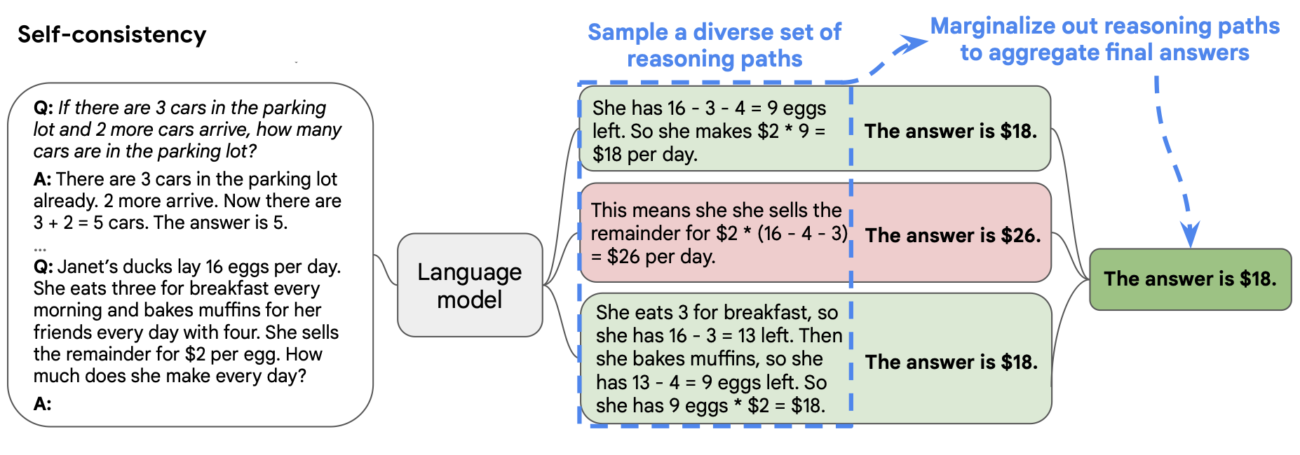 3.2、自洽性(Self-Consistency) 一种对抗「幻觉」的手段。就像我们做数学题,要多次验算一样。