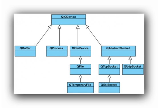 文件操作是应用程序必不可少的部分。Qt 作为一个通用开发库,提供了跨平台的文件操作能力。Qt 通过QIODevice提供了对 I/O 设备的抽象,这些设备具有读写字节块的能力。下面是 I/O 设备的类图(Qt5):