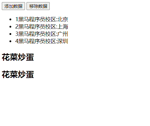 <ul> <li v-for="(it,index) in arr"> {{ index+1 }}黑马程序员校区:{{ it }} </li> </ul> <h2 v-for="item in vegetables" v-bind:title="item.name"> {{ item.name }} </h2> </div> <script src="https://cdn.jsdelivr.net/npm/vue/dist/vue.js"></script> <script> var app = new Vue({ el:"#app", data:{ arr:["北京","上海","广州","深圳"], vegetables:[ {name:"西兰花炒蛋"}, {name:"蛋炒西蓝花"} ] }, methods: { add:function(){ this.vegetables.push({ name:"花菜炒蛋" }); }, remove:function(){ this.vegetables.shift(); } }, }) </script> </body>