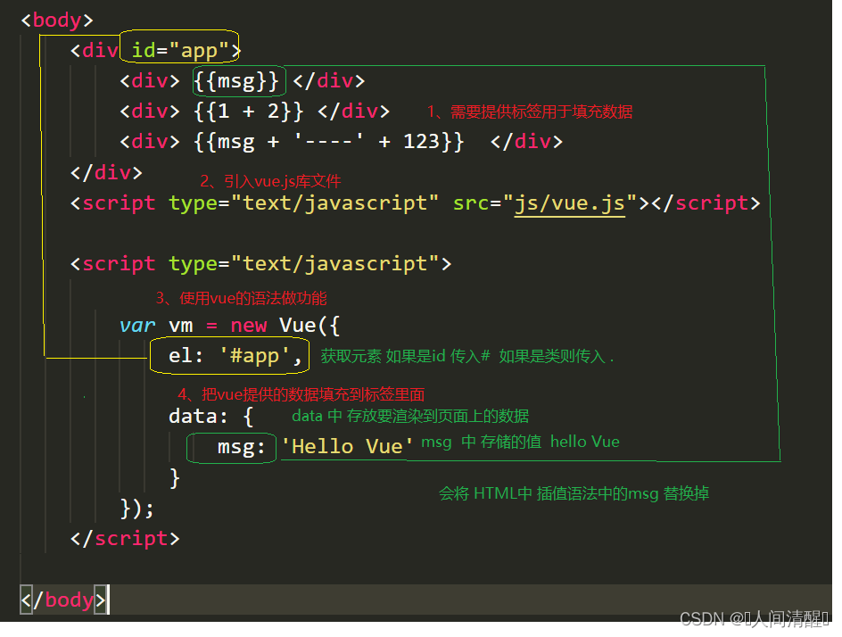 1 | <!-- 即使data里面定义了msg 后期我们修改了 仍然显示的是第一次data里面存储的数据即 Hello Vue.js --> |